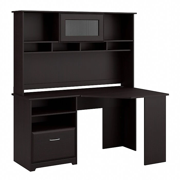 The stylish and functional Bush Furniture Cabot Corner Desk with Hutch offers everything you need for a space-saving home office solution. The Corner Desk with Hutch combination is ideal for small spaces yet provides ample room to work and stay organized. The Corner Desk’s pedestal can be placed on the right or left side for user comfort. A full-extension file drawer glides on smooth ball bearing slides for an easy reach to documents, and an open cubby shelf works perfectly for displaying books and more. Cable management grommets let you easily hide cords. The Hutch boasts an elegant fluted glass door, two open compartments and four work-in-process areas. Chrome-finished hardware completes the timeless design. See the full collection for coordinating items. Backed by a 1 Year Warranty.