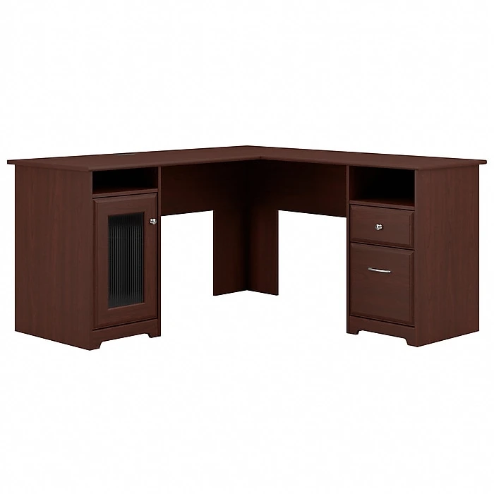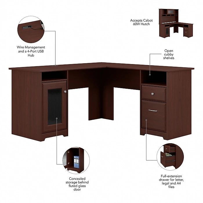 The Bush Furniture Cabot L Shaped Desk offers a spacious and efficient workplace for your home or office. Enjoy a beautiful traditional look with smart features for your convenience. The L Shaped Desk design provides a large durable work surface and just the right amount of storage to keep you feeling neat and organized. Desk storage details include an enclosed cabinet with stylish fluted glass door and a box drawer for supplies. A file drawer glides on smooth full-extension ball bearing slides and accommodates letter, legal or A4 sized paperwork. A built-in 4-port USB hub keeps your devices connected. The unique design saves space but provides you with 60 inches to spread out in either direction. Chrome-finished hardware creates a simple, elegant and timeless appearance. Add the Cabot Hutch (sold separately) to create a complete office set. Backed by a 1 Year Warranty.