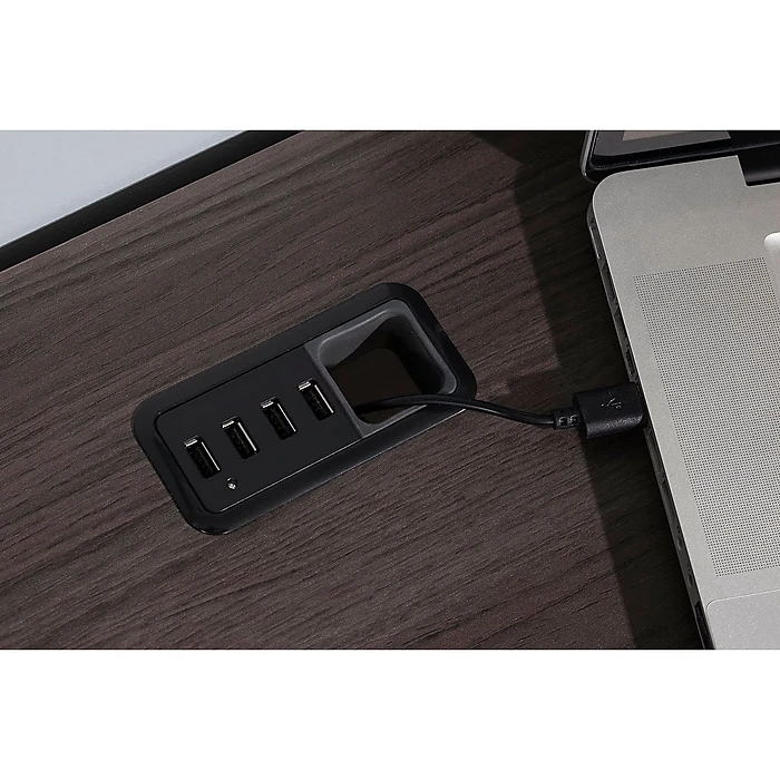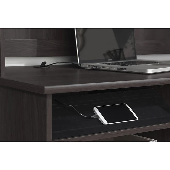 - The Harvest Cherry and Espresso Oak Desks contain a handy charging station; the Heather Gray Desk features a full shelf for paperwork and supplies