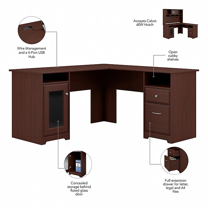 The stylish and functional Bush Furniture Cabot L Shaped Desk with Hutch and Small Storage Cabinet offers a spacious work area for your home or office. Enjoy a beautiful traditional look with smart features. The L Shaped Desk design provides a large durable work surface and storage details including an enclosed cabinet with stylish fluted glass door, a box drawer for supplies and a full-extension file drawer gliding on smooth ball bearing slides. Technology features such as a built-in 4-port USB hub add convenience. The Hutch boasts a matching fluted glass door, large open compartments and four work-in-process areas. The Small Storage Cabinet with Doors offers a stylish approach to organizing books, personal items or supplies. Keep everything in order and out of sight with an adjustable shelf to accommodate items of varying sizes. Backed by a 1 Year Warranty. Meets ANSI/SOHO standards.