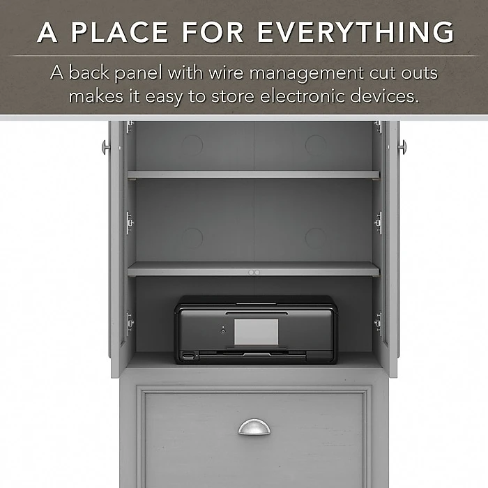 - Two-door cabinet with drawer offers even more concealed storage for miscellaneous items you want kept in order but out of sight