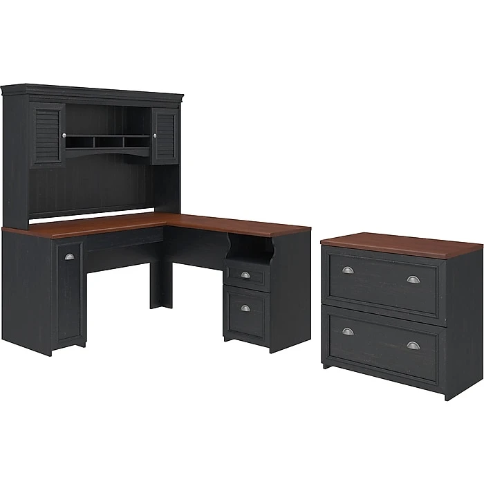 - Bundle includes: 60″W L-shaped desk, hutch for L-shaped desk, lateral file cabinet