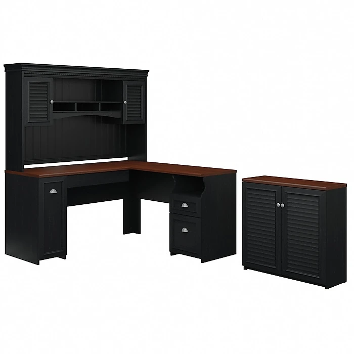 The Bush Furniture Fairview 60W L Shaped Desk with Hutch and Small Storage Cabinet with Doors is the perfect home office set to invoke the cozy, welcoming feel of modern farmhouse styling. A slightly weathered finish pairs well with Antique Pewter hardware to create a casual look, while durable construction and practical features ensure its long lasting appeal. The L Shaped Desk delivers plenty of surface area to spread out and get work done without taking up too much space. The Hutch can mount to either side and utilizes two louvered cabinets that flank open display spaces in the middle. The matching louvered doors of the 2 door Storage Cabinet create a coordinated look and conceal shelves that can be adjusted to hold a variety of supplies. All items are tested to meet ANSI/SOHO standards for safety and performance and are backed by the Bush Furniture 6 Year Manufacturer’s Warranty.