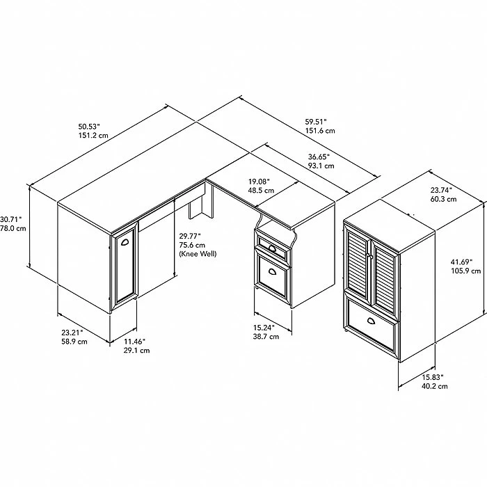 Allow your home or office to take on the welcoming charm of modern farmhouse styling with the Bush Furniture Fairview 60W L Shaped Desk and Storage Cabinet with Drawer. The design of the L Shaped Desk saves space while still providing a large enough surface to comfortably take on your daily tasks. A vertical storage compartment, box and file drawers, and an open cubby area offers plenty of organization capability in addition to a convenient drop down front drawer that can easily store a laptop or keyboard. The Storage Cabinet’s louvered doors conceal two adjustable shelves for flexible organization while a file drawer opening on smooth ball bearing slides makes accessing letter and legal size documents a breeze. This white office furniture set is tested to meet ANSI/SOHO standards for safety and performance and is backed by the Bush Furniture 6 Year Manufacturer’s Warranty.