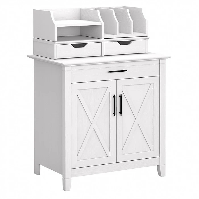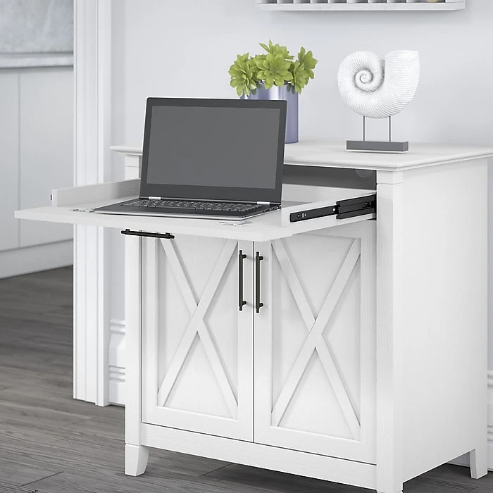 The Bush Furniture Key West secretary desk with storage and desktop organizers provides a compact personal workspace with casual farmhouse style. Use the compact Bush Furniture Key West secretary desk with storage and desktop organizers to create a functional home office in any sized space. This 30″W x 20″D x 30″H small computer desk serves as a central location for your laptop and offers a casual storage solution that works subtly in any room. The convenient top drawer opens on smooth full-extension ball bearing slides and includes a flip-down front that folds up neatly when not in use. The built-in storage cabinet features one adjustable shelf to help you organize work materials and supplies of various sizes. The desk organizers add two drawers for small office supplies along with horizontal and vertical shelves for sorting mail, memos and work in progress. This laptop storage credenza with organization is tested to meet ANSI/SOHO quality standards for safety and performance and is backed by a 1-year manufacturer’s warranty.