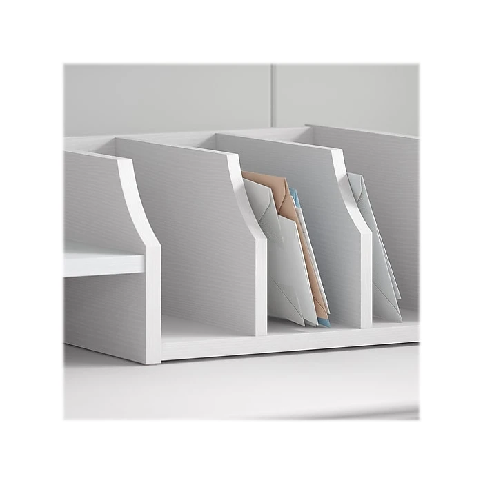 - Upper half features horizontal and vertical shelves for sorting mail, memos, and work in progress