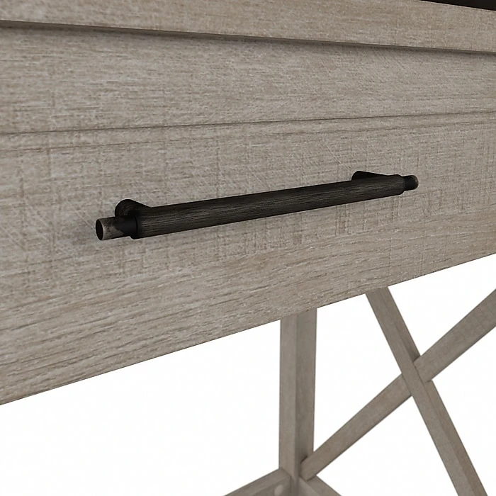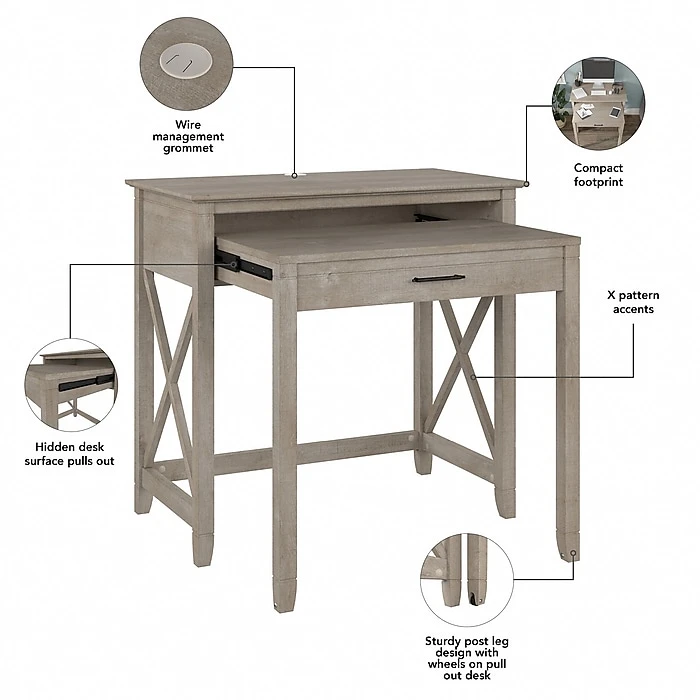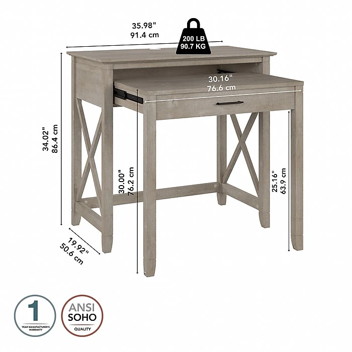 The Bush Furniture Key West 36″ pull-out writing desk offers a compact workspace solution that brings a touch of casual style to any room in your home. Perfect for those with limited space, this small desk provides enough room to take on projects and assignments without the need for a large dedicated work area. The primary work surface easily supports a computer, books, and other materials with a weight capacity of 200 lbs. A second desktop slides out from underneath for convenient access to your keyboard, laptop, stationery, and more. Built-in wire management keeps cords and cables out of the way, so you can enjoy a clutter-free workspace. X-pattern accents convey a casual appearance that works well with cottage, coastal, and modern farmhouse style.