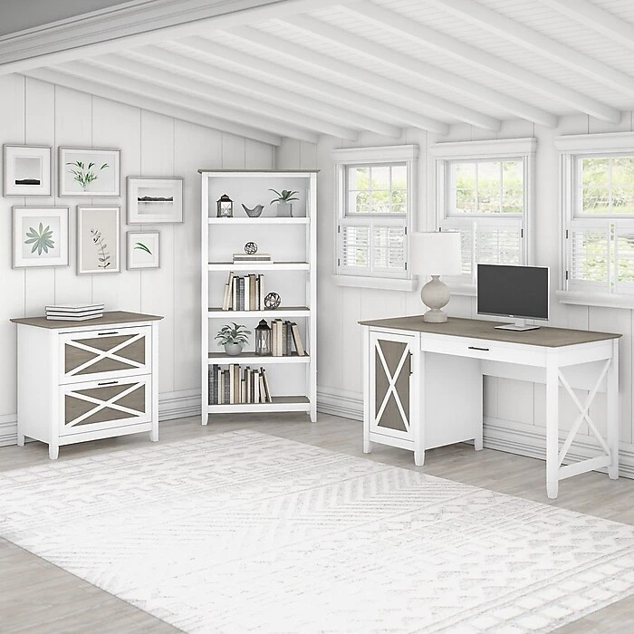 Designing your ideal home office is a breeze thanks to the Bush Furniture Key West computer desk with storage. The 54″W x 24″D work surface offers plenty of room to spread out with a computer and paperwork as you surf the web, pay bills, or check the mail. A pullout keyboard tray features a flip-down front that folds up neatly when not in use. The drawer also provides a convenient place to keep your laptop or tablet and opens on smooth full-extension ball bearing slides. A built-in storage cabinet includes one adjustable shelf to accommodate reference materials and office supplies of various sizes. The sturdy and attractive post leg design allows the computer desk to support up to 200 lbs., so you can keep books and other equipment close by while you work. This home office desk is tested to meet ANSI/SOHO quality standards for safety and performance and is backed by a 1-year warranty.