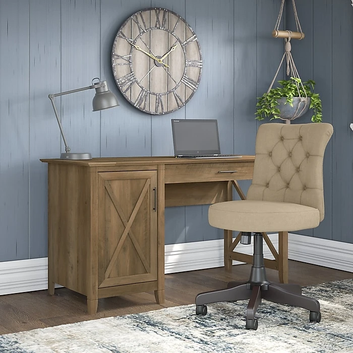 The Bush Furniture Key West 54″W computer desk with storage and mid-back tufted office chair brings a relaxed style to any home workspace. Spread out with a computer and paperwork on the 54″W x 24″D desktop as you take on your next project, pay bills, or surf the web. A keyboard tray with a flip-down front pulls out from under the desk and can also be used to hold a laptop. Keep reference materials and office supplies organized and accessible inside a built-in storage cabinet with one adjustable shelf. The office chair, featuring button-tufted upholstery and a scrolled backrest, provides a perfect complement to Key West’s easygoing style. Foam cushioning gives the seat a medium-firm feel while the adjustable desk chair’s height and tilt tension can be adjusted to meet your own preferences. This desk and chair set is tested to meet ANSI/SOHO standards and is backed by a 1-year warranty.