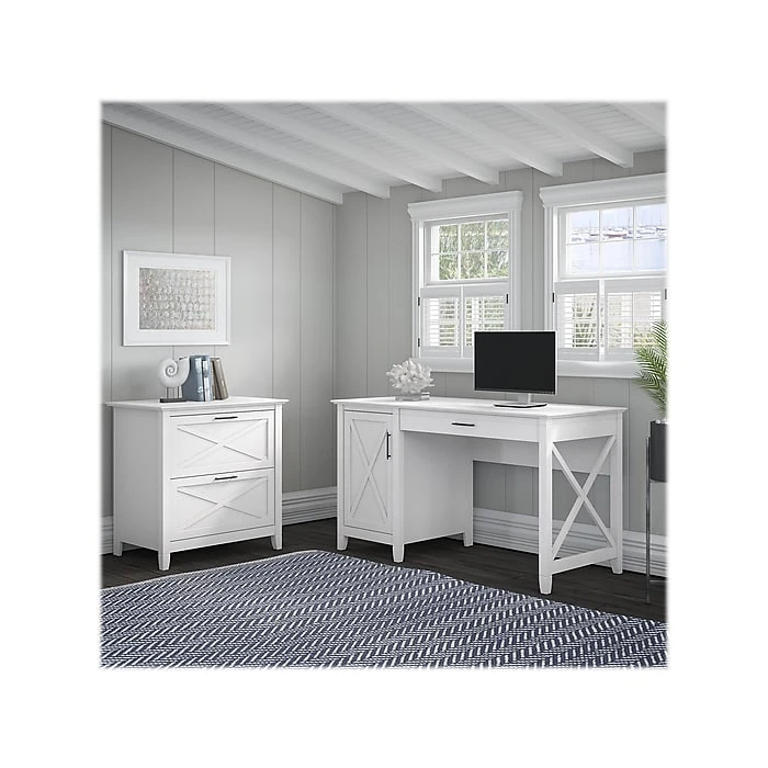 The Bush Furniture Key West 54″W computer desk with storage and two-drawer lateral file cabinet provides a home office furniture set with a casual farmhouse style. It offers a refreshing approach to working in your home. Spread out with a computer, books and paperwork on a durable desktop that boasts a weight capacity of 200 pounds. The convenient top drawer is an ideal place to store your keyboard or laptop and has a flip-down front that folds up neatly when not in use. The desk also includes a built-in storage cabinet with one adjustable shelf to accommodate materials of various sizes. The lateral filing cabinet’s drawers open on smooth full-extension ball-bearing slides for an easy reach to legal- and letter-size documents. Unique X pattern accents create a relaxed feel with a sturdy and attractive post leg design. This office desk set is tested to meet ANSI/SOHO quality standards for safety and performance and is backed by a 1-year warranty.