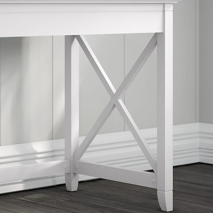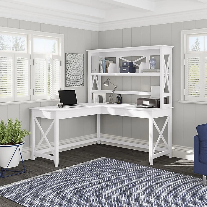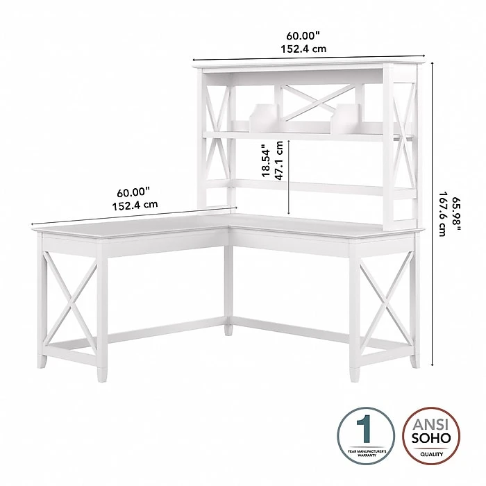 With its practical design and easy-going style, the Bush Furniture Key West 60″W L-shaped desk with hutch offers a perfect workspace solution for home offices. The durable work surface is spacious enough to spread out with a computer, paperwork, and more when taking on your task of the day or just browsing the web. A sturdy post leg design with X-shaped accents on the side panels creates a relaxed, open appearance, while thoughtful construction and quality materials allow the corner desk to support up to 200 lbs. The hutch attaches to whichever side you prefer for convenient access to materials. Its three upper compartments are perfect for storing books and binders, or brightening up your home office with pictures and decorations. The L-shaped computer desk set is tested to meet ANSI/SOHO standards for safety and performance and is backed by 1-year warranty.