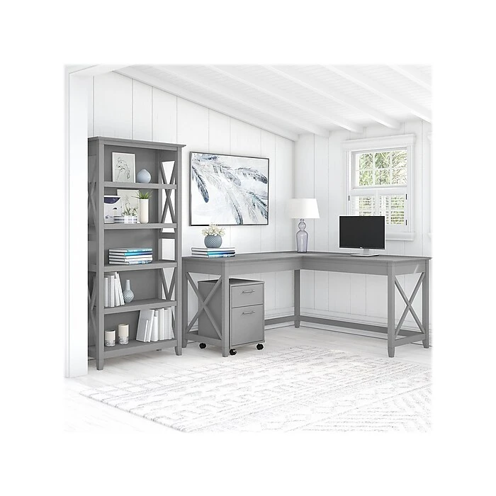Create a personal workspace with easy going style and plenty of storage for all the materials you need to stay productive. The Bush Furniture Key West 60W L Shaped Desk with Mobile File Cabinet and 5 Shelf Bookcase offers an ideal set up for home and small offices. Save floor space by placing the 60W x 60D Desk in a corner or make use of the fully finished back to take a prominent position in the middle of the room. The 2 drawer filing cabinet fits under the L Desk and has front locking casters for secure placement. The file drawer organizes letter size documents while a box drawer keeps office supplies and utensils close by. The Bookcase features 3 adjustable shelves for flexible storage and display along with 2 fixed shelves for stability. This L shaped computer desk with storage set is tested to meet ANSI/SOHO standards for safety and performance and is backed by a 1 Year Warranty.