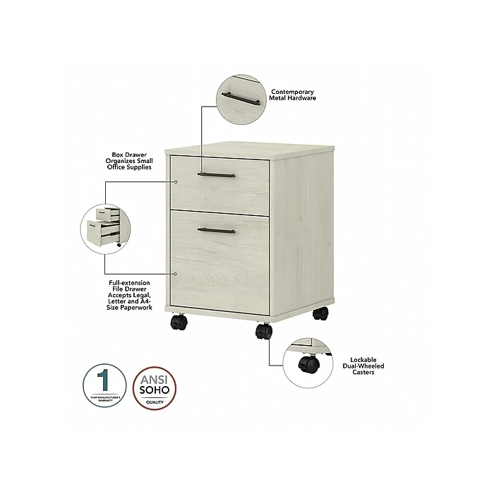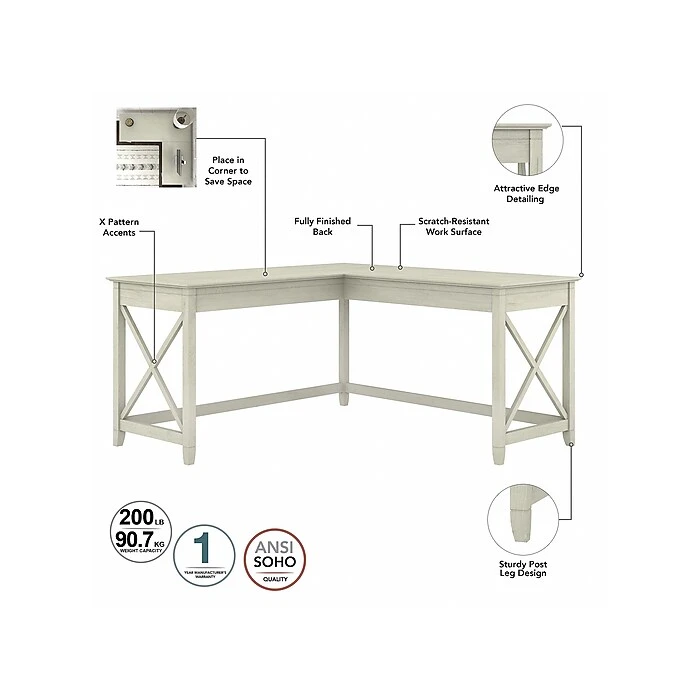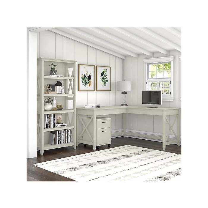 Create a personal workspace with easy going style and plenty of storage for all the materials you need to stay productive. The Bush Furniture Key West 60W L Shaped Desk with Mobile File Cabinet and 5 Shelf Bookcase offers an ideal set up for home and small offices. Save floor space by placing the 60W x 60D Desk in a corner or make use of the fully finished back to take a prominent position in the middle of the room. The 2 drawer filing cabinet fits under the L Desk and has front locking casters for secure placement. The file drawer organizes letter size documents while a box drawer keeps office supplies and utensils close by. The Bookcase features 3 adjustable shelves for flexible storage and display along with 2 fixed shelves for stability. This L shaped computer desk with storage set is tested to meet ANSI/SOHO standards for safety and performance and is backed by a 1 Year Warranty.