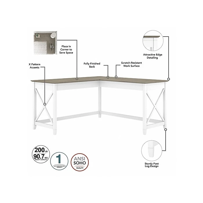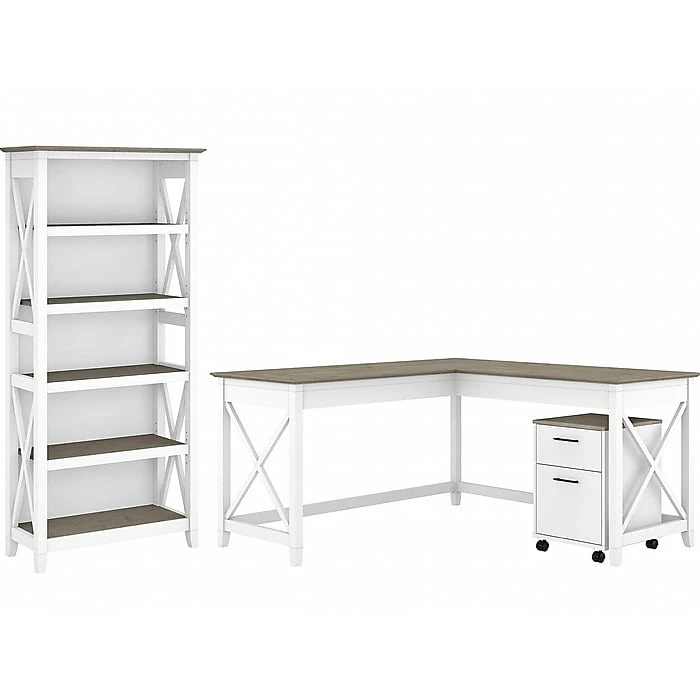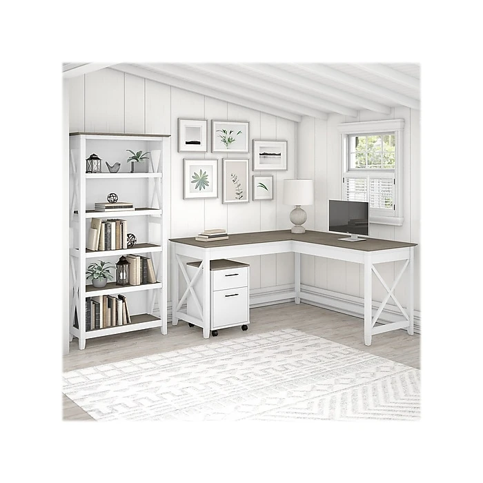 Create a personal workspace with easy going style and plenty of storage for all the materials you need to stay productive. The Bush Furniture Key West 60W L Shaped Desk with Mobile File Cabinet and 5 Shelf Bookcase offers an ideal set up for home and small offices. Save floor space by placing the 60W x 60D Desk in a corner or make use of the fully finished back to take a prominent position in the middle of the room. The 2 drawer filing cabinet fits under the L Desk and has front locking casters for secure placement. The file drawer organizes letter size documents while a box drawer keeps office supplies and utensils close by. The Bookcase features 3 adjustable shelves for flexible storage and display along with 2 fixed shelves for stability. This L shaped computer desk with storage set is tested to meet ANSI/SOHO standards for safety and performance and is backed by a 1 Year Warranty.