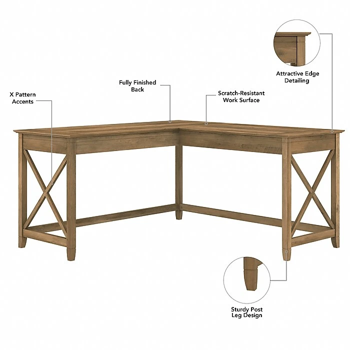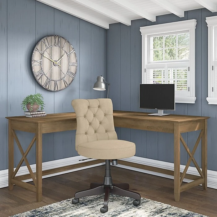 The Bush Furniture Key West L-shaped desk with mid-back tufted office chair offers a practical personal workspace with relaxed farmhouse style. With its practical design and easygoing style, L-shaped desk and chair set offers a perfect workspace solution for home offices. Save space in compact areas by placing the L-desk in a corner or make use of the finished back to take a prominent position in the middle of the room. The durable work surface is spacious enough to spread out with a computer, paperwork, and more while supporting up to 200 lbs. The mid-back office chair, highlighted by its button-tufted upholstery and scrolled backrest, provides a natural complement to Key West’s easygoing style. Foam cushioning gives the seat a medium-firm feel while the swivel chair’s height and tilt tension can be easily adjusted to meet your own personal preferences.