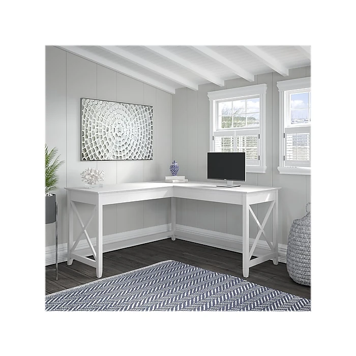The Bush Furniture Key West 60″W L-shaped desk features an easy-going style that makes it a perfect choice for your casual home office or living space. Save floor space in compact areas by placing the desk in a corner or make use of the fully finished back to take a prominent position in the middle of the room. The durable work surface is spacious enough to spread out with a computer, paperwork and more when taking on your task of the day or just browsing the web. A sturdy post leg design with unique X pattern accents on the side panels creates a relaxed, open appearance while thoughtful construction and quality materials allow the corner desk to support up to 200 pounds. This L-shaped computer desk is tested to meet ANSI/SOHO quality standards for safety and performance and is backed by a 1-year manufacturer’s warranty. See the full collection for coordinating items available.