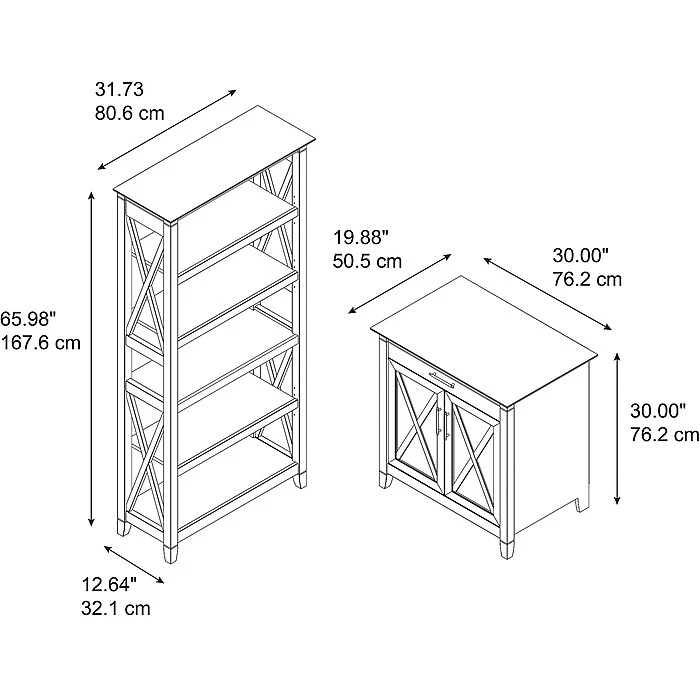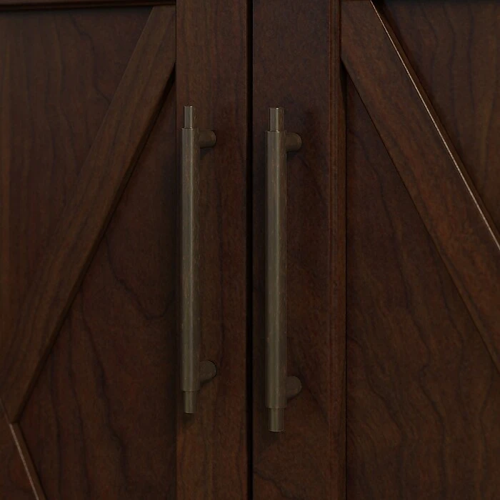 The Bush Furniture Key West Laptop Storage Desk Credenza and 5 Shelf Bookcase set offers the perfect space for your laptop, plus a storage solution that fits in any room. The convenient pull out keyboard drawer with a flip down front folds up neatly. Includes wire management and full extension ball bearing slides. Display your favorite art, photos and more on this 5 Shelf Bookcase with three adjustable shelves for flexible storage and two fixed shelves for stability. Enjoy the look of natural reclaimed wood with an authentic Bing Cherry finish, Aged Bronze hardware and an attractive post leg design. Work in style with the unique X pattern accent on the doors and airy bookcase side panels. Wall attachment hardware included. Meets ANSI/SOHO standards for safety and performance. Backed by the Bush Furniture 1 Year Manufacturer’s Warranty. See the full collection for coordinating items.