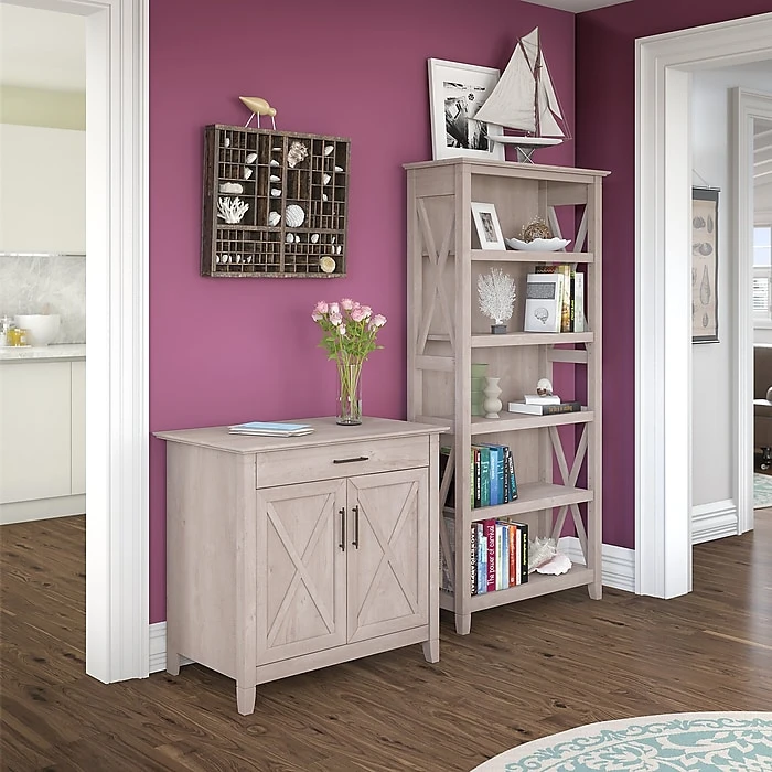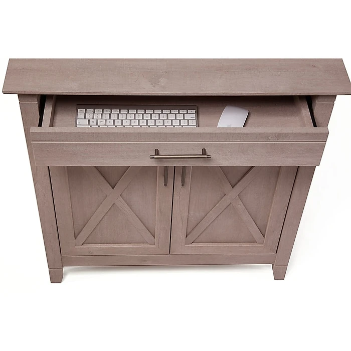 The Bush Furniture Key West Secretary Desk with Keyboard Tray and Storage Cabinet provides a space for your laptop computer and creates a casual storage solution that works subtly in any room. The convenient pull out keyboard drawer with a flip down front folds up neatly. Includes wire management and full extension ball bearing slides for reliable use. Storage compartment has one adjustable shelf with a unique X pattern accent on the door panels for a relaxed style. Key West offers the look of natural reclaimed wood with an authentic Washed Gray finish complemented by Aged Bronze hardware and an attractive post leg design. Let the Key West Collection turn your home or office into an island escape. Meets ANSI/SOHO standards for safety and performance and is backed by the Bush Furniture 1 Year Manufacturer’s Warranty.