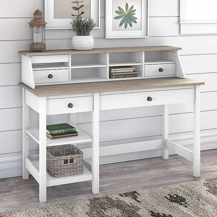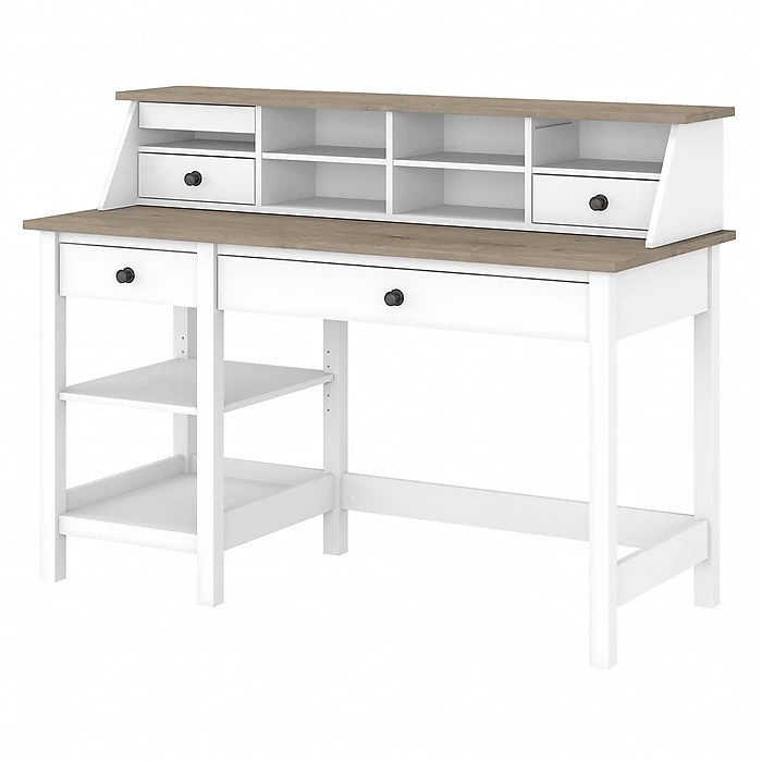 The Bush Furniture Mayfield 54″W computer desk with shelves and desktop organizer give your home office a touch of relaxed modern farmhouse style. Stay on top of your daily tasks with a workspace that suits your casual home. Highlighted by its relaxed modern farmhouse style, the Bush Furniture Mayfield 54″W computer desk with shelves and desktop organizer also include plenty of practical features to keep you feeling productive. Spread out on a durable 54″W x 23″D work surface that supports a computer, books, and more with a weight capacity of 200 lbs. Two shelves and a small box drawer ensure that the papers and office supplies you need are always within reach. A larger drawer with a flip-down front pulls out to provide easy access to your keyboard or laptop. The desk organizer adds eight cubbies with two pencil drawers that fit in any space and a pull-out accessory shelf for your phone or tablet. This farmhouse desk with storage is tested to meet ANSI/SOHO standards for safety and performance and is backed by a 1-year warranty.