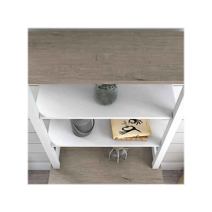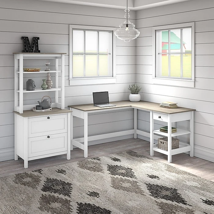 The Bush Furniture Mayfield 60″W L-shaped computer desk with lateral file cabinet and hutch gives your home office a touch of modern farmhouse style. Stay on top of your daily tasks with a workspace that suits your casual home. Highlighted by its relaxed modern farmhouse style, the Bush Furniture Mayfield 60″W L-shaped computer desk with lateral file cabinet and hutch also includes plenty of practical features to keep you feeling productive. Spread out on a durable 60″W x 60″D corner desk surface that supports a computer, books and more with a weight capacity of 200 pounds. Two shelves and a small box drawer ensure that supplies are always within reach. Store your legal, letter and A4-size documents inside a two-drawer lateral filing cabinet that opens on smooth full-extension ball bearing slides for an easy reach to contents. The tall hutch organizer adds an open storage area for books and decorations. This farmhouse desk with storage set is tested to meet ANSI/SOHO standards for safety and performance and is backed by a 1-year warranty.