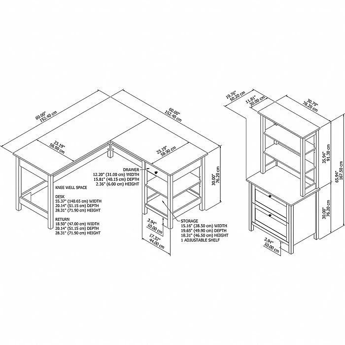 | Included With Bundle | Bundle includes: 60″W L-shaped computer desk with storage, two-drawer lateral file cabinet, tall hutch organizer |