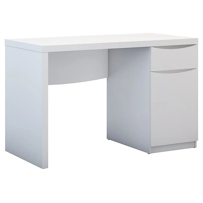 With an attractive, contemporary design, the Bush Furniture Montrese Computer Desk fits in small spaces but offers total functionality. Let the modern styling blend seamlessly into your home office, bedroom, dorm or living room. The compact design and finished back provide placement flexibility – so put the small desk in a tight space or the middle of a room. The stylish but sturdy desk comes with reliable features, allowing Montrese to work in a home office or small business. Spread out with your laptop, pay bills, surf the net or finish homework on the durable surface. Store office supplies in the smooth box drawer, which glides on ball bearing slides for easy access to contents. Hide larger items from sight in the closed storage cabinet with an adjustable shelf and smooth, self-closing European-style hinges. Durable edge banding helps prevent nicks. Backed by a 1 Year Warranty.