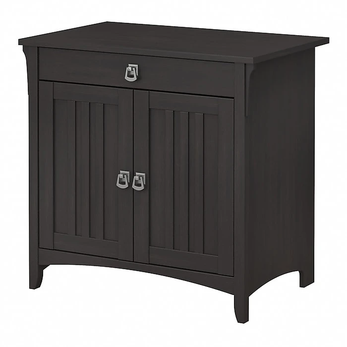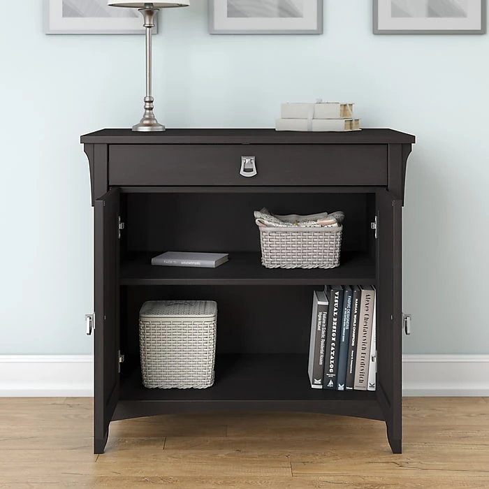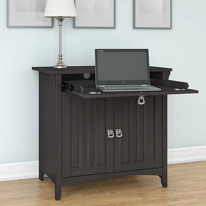 Enjoy a practical personal workspace that fits anywhere in your home with the Bush Furniture Salinas table. Measuring just 30″H x 31.5″W x 20″D, this small desk with storage is perfect for when it’s time to pay bills, check the mail or surf the web. The convenient pullout keyboard tray also accepts a laptop or tablet while office supplies, stationery and other work materials are kept organized inside the built-in storage cabinet. The cabinet’s doors open on smooth Euro style hinges to reveal one adjustable shelf that moves up and down to accommodate larger items like binders and photo albums. Inspired by timeless mission style, this compact writing desk features tapered legs, curved base rails and decorative wood accents that blend seamlessly with farmhouse and cottage decor.