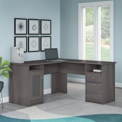 The Bush Furniture Salinas small computer desk with hutch takes timeless Mission styling and adds plenty of modern touches to help you complete your daily tasks. Technology-ready features include a pullout keyboard tray or laptop shelf and a work surface with a built-in wire management system to keep cords and cables in order. The hutch has plenty of storage space for work in progress, books, decorations, and more while the 48″W desk features a vertical cabinet with one adjustable shelf along with a box drawer to organize office supplies and writing utensils. This computer desk is perfect for small spaces. The compact design boasts a sturdy construction with clean lines, tapered legs, and attractive wood detailing. The durable desktop supports up to 150 lbs. and offers ample space to complete projects and assignments, pay bills, or surf the web. This home office desk set is backed by a 1-year warranty.