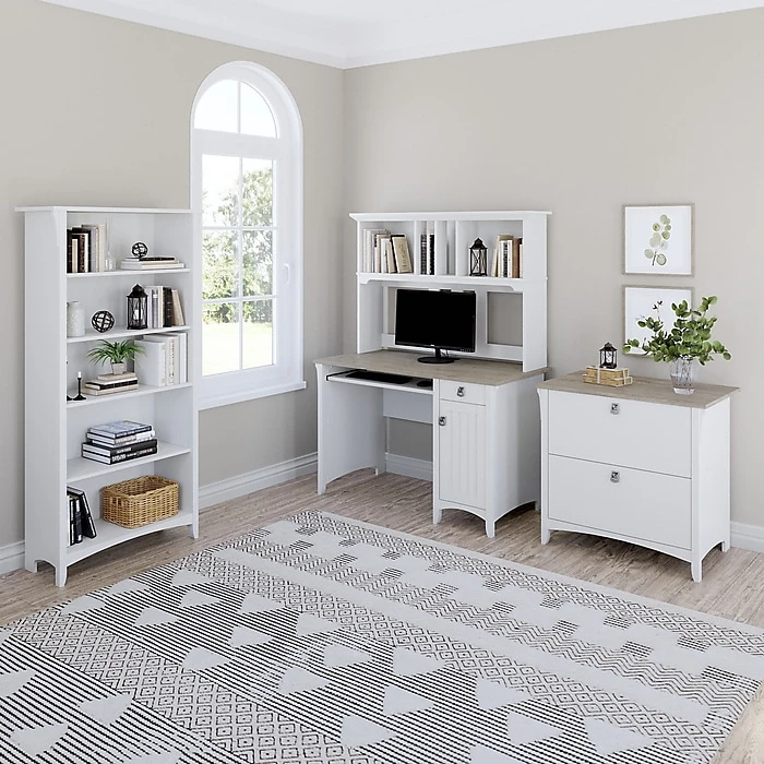 The Bush Furniture Salinas small computer desk with hutch takes timeless Mission styling and adds plenty of modern touches to help you complete your daily tasks. Technology-ready features include a pullout keyboard tray or laptop shelf and a work surface with a built-in wire management system to keep cords and cables in order. The hutch has plenty of storage space for work in progress, books, decorations, and more while the 48″W desk features a vertical cabinet with one adjustable shelf along with a box drawer to organize office supplies and writing utensils. This computer desk is perfect for small spaces. The compact design boasts a sturdy construction with clean lines, tapered legs, and attractive wood detailing. The durable desktop supports up to 150 lbs. and offers ample space to complete projects and assignments, pay bills, or surf the web. This home office desk set is backed by a 1-year warranty.