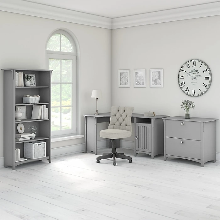 The Bush Furniture Salinas 55″W corner desk with lateral file cabinet and five-shelf bookcase gives your home office a touch of casual farmhouse style. The Bush Furniture Salinas 55″W corner desk with lateral file cabinet and five-shelf bookcase features versatile, space-saving designs that offer a great personal workspace for your casual home. Tackle your next project on the 55-inch desk surface while stashing essential work materials inside the attached storage cabinet. The cabinet contains one adjustable shelf and can be placed on either side for a right or left-handed configuration. The lateral filing cabinet accepts legal and letter-size documents while the tall bookshelf is perfect for organizing your personal library or displaying pictures and decorations. Three of the bookcase shelves are adjustable for flexible storage and two are fixed for stability.