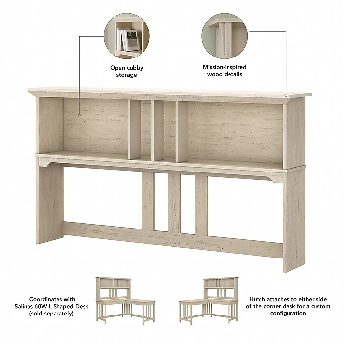 Expand the capacity of your personal workspace with the Bush Furniture Salinas 60W Hutch. Attach the Hutch to either side of the Salinas L Shaped Desk (sold separately) to create storage and display space for books, photos, decorations and more. Two large open cubby areas on either side hold bigger items, and a pair of smaller spaces in the middle are perfect for storing important documents and work-in-progress. The Hutch leaves plenty of room to accommodate large computer monitors or even dual monitors. Decorative wood accents inspired by timeless Mission styling look great in your choice of Antique White, Cape Cod Gray and Vintage Black finishes. The Hutch for L Shaped Desk is tested to meet ANSI/SOHO quality standards for safety and performance and is backed by a 1 year manufacturer’s warranty. Complete your space with coordinating modern farmhouse items from the Salinas Collection.