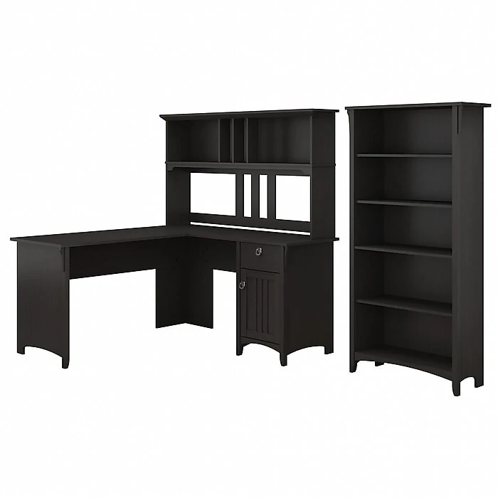 Featuring a comfortable design and plenty of storage capacity, the Bush Furniture Salinas 60W L Shaped Desk with Hutch and 5 Shelf Bookcase offers an ideal home office solution for those who value both style and function. Spread out and multitask on the L Shaped surface, designed to save space by fitting into a corner. Store writing utensils and small office supplies in the convenient box drawer and keep larger items in a storage cabinet with an adjustable shelf. The 60W Hutch attaches to either side of the corner desk and features two large open cubby areas as well as a pair of smaller spaces for storage and display. A pair of fixed shelves give the Bookcase stability while three adjustable shelves allow you to store items of various sizes. This cottage style furniture set is tested to meet ANSI/SOHO quality standards for safety and performance and is backed by a 1 year warranty.