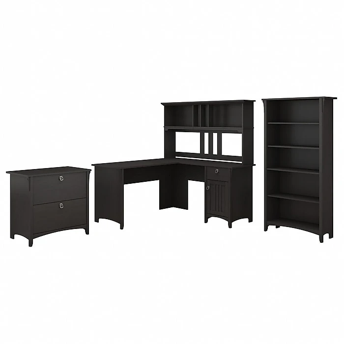 The Bush Furniture Salinas 60W L Shaped Desk with Hutch, Lateral File Cabinet and 5 Shelf Bookcase offers a comprehensive home office solution with casual style. Spread out and multitask on the L Shaped surface, designed to save space by fitting into a corner. Store writing utensils and supplies in the convenient box drawer and keep larger items in a cabinet with an adjustable shelf. The Hutch attaches to either side of the corner desk and features 2 large cubby areas as well as 2 smaller spaces for storage and display. The 2 drawer filing cabinet opens on full-extension ball bearing slides for an easy reach to legal and letter size documents. A pair of fixed shelves give the Bookcase stability while 3 adjustable shelves accommodate items of various sizes. This furniture set is tested to meet ANSI/SOHO quality standards for safety and performance and is backed by a 1 year warranty.