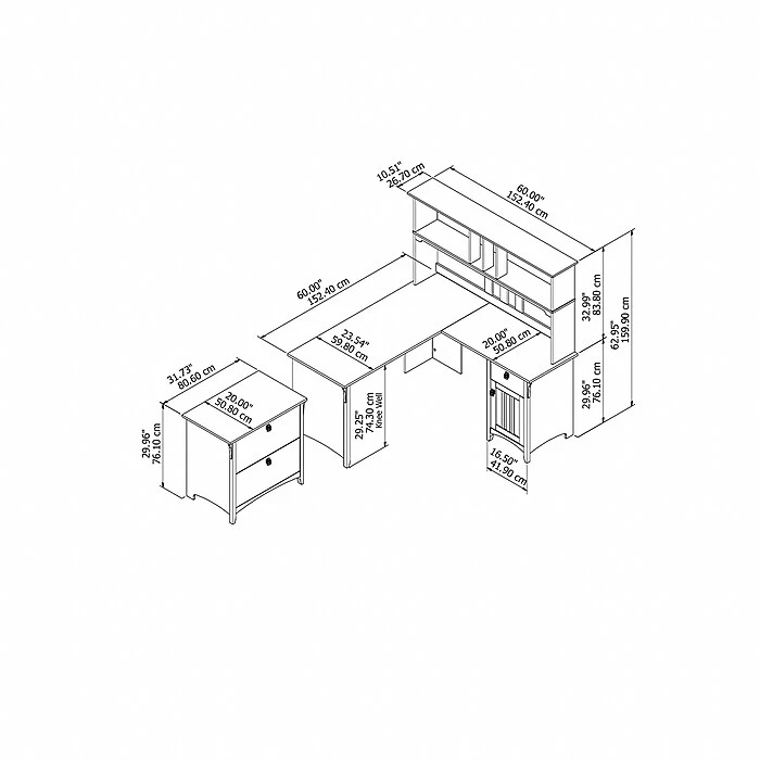 Featuring a comfortable design and plenty of storage capacity, the Bush Furniture Salinas 60W L Shaped Desk with Hutch and Lateral File Cabinet offers an ideal home office solution for those who value both style and function. Spread out and multitask on the L Shaped surface, designed to save space by fitting into a corner. Store writing utensils and office supplies in the convenient box drawer and keep larger items in a storage cabinet with an adjustable shelf. The Hutch attaches to either side of the corner desk and features 2 large open cubby areas as well as 2 smaller spaces for storage of books, decorations and more. The 2 drawer filing cabinet opens on full-extension ball bearing slides for an easy reach to legal and letter size documents. This cottage style furniture set is tested to meet ANSI/SOHO quality standards for safety and performance and is backed by a 1 year warranty.