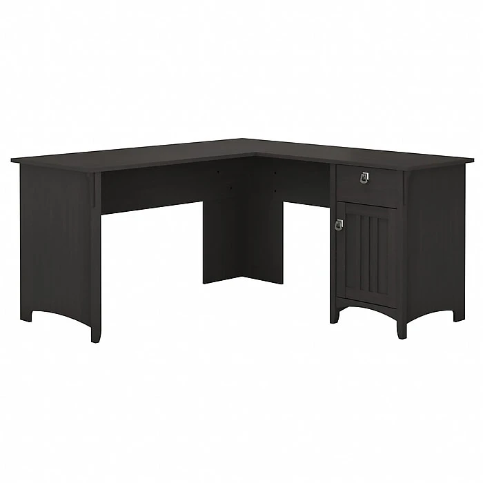 Make your home office space comfortable, functional and beautiful with the Bush Furniture Salinas L Shaped Desk. Attractive wood details, vertical accents and tapered legs create a casual look fit for a cottage, family home or apartment. Metal drop pull hardware complements the Vintage Black finish, which features a distressed touch to add a country feel to your space. You’ll love all the room you have to multitask on the L Shaped Desk surface, designed to save space in your home with a variety of placement options, including in the corner. Have a cup of coffee as you surf the net, pay bills or read a good book, and enjoy all the legroom you need with the open design. A box drawer stores small office items while a storage cabinet includes an adjustable shelf for larger supplies. Backed by a 1 Year Warranty, the L Shaped Desk with Storage meets ANSI/SOHO standards for safety and quality.