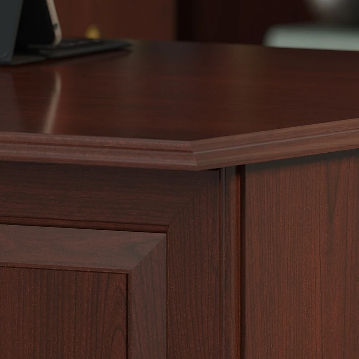 The Bush Furniture Saratoga L Shaped Computer Desk offers luxurious looks at a lasting value. Pen letters, pay bills or outfit your professional-grade home or private office with a traditional L Shaped Desk built for everyday use. The thermally fused laminate surface lasts for years while resisting scratches and stains to protect the warm Harvest Cherry finish. Enjoy all the workspace you need to multitask on the L Shaped Desk, which can be assembled for left or right-handed users. Gold-finished Brass hardware and timeless design accents match the traditional styling of your home office or workspace. Not just for looks, the Computer Desk includes a wide retracting keyboard shelf and three full-extension file drawers, which open on smooth ball-bearing slides. Two box drawers hold office supplies. Backed by a 10 Year Warranty, Saratoga meets ANSI/BIFMA performance and safety standards.