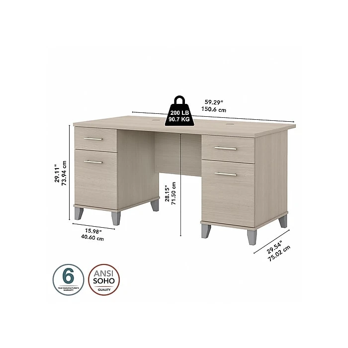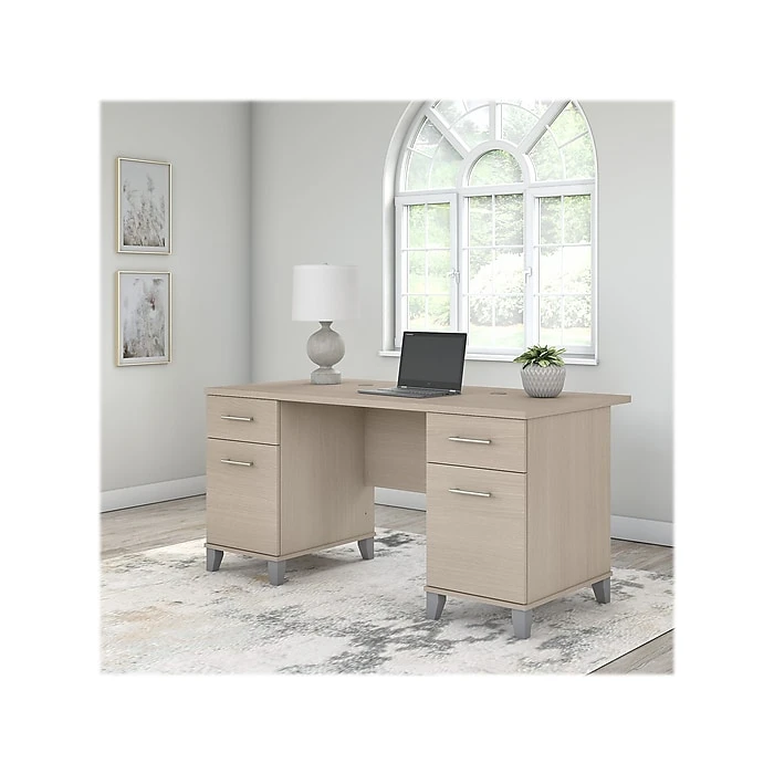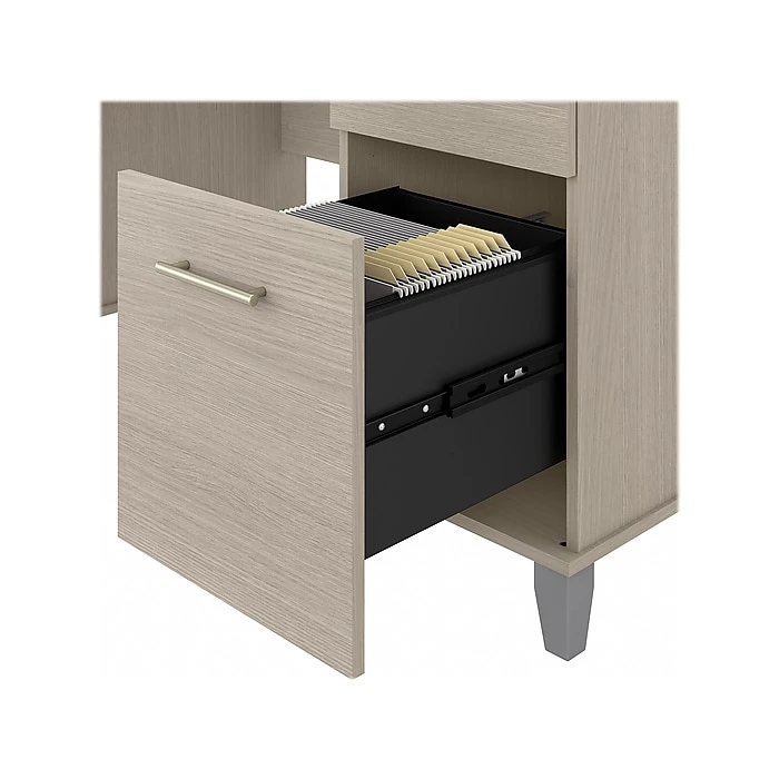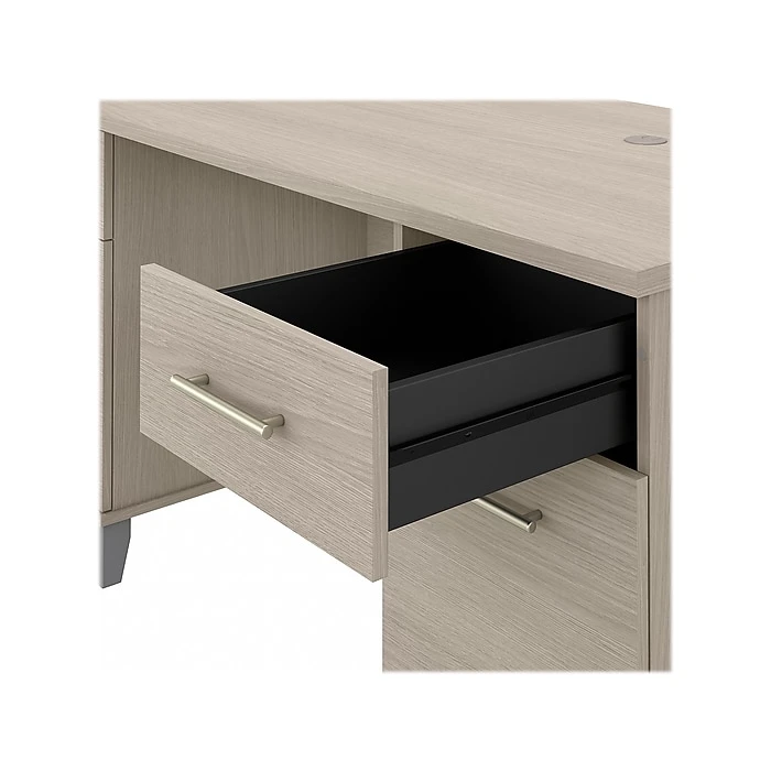 Make the best use of your workspace with the Bush Furniture Somerset 60″W office desk. The perfect choice for your home office, the extended surface provides plenty of room to spread out and features built-in wire management grommets to keep cords in order. Stay organized with two box drawers to house miscellaneous office supplies and file drawers with smooth ball bearing slides for storing letter-size documents. Transitional styling includes tapered leg accents, a stylish finish, and contemporary metal hardware for an alluring appearance. This computer desk with drawers is tested to meet ANSI/SOHO quality standards for safety and performance. See the full Bush Furniture Somerset collection for coordinating items to complete your personal workspace. American-made with US and imported parts.