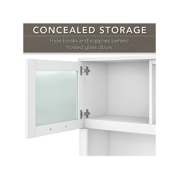 Build your perfect home office around the stylish and functional Bush Business Furniture Somerset L-shaped desk with hutch and lateral file cabinet. The 60″W surface with a wire management grommet offers ample room to spread out while a pull-out tray for a keyboard or laptop, vertical cabinet, box drawer, and file drawer provide plenty of storage space for supplies. The hutch has an open compartment and two frosted glass doors for concealed storage. The lateral file cabinet features smooth ball-bearing slides for easy access to legal- and letter-size paperwork and drawers that open one at a time for maximum stability. The transitional styling includes an attractive finish with tapered leg accents and contemporary metal hardware. This home office furniture set is tested to meet ANSI/SOHO quality standards for safety and performance.