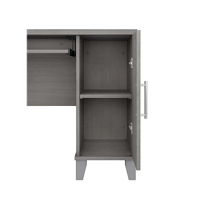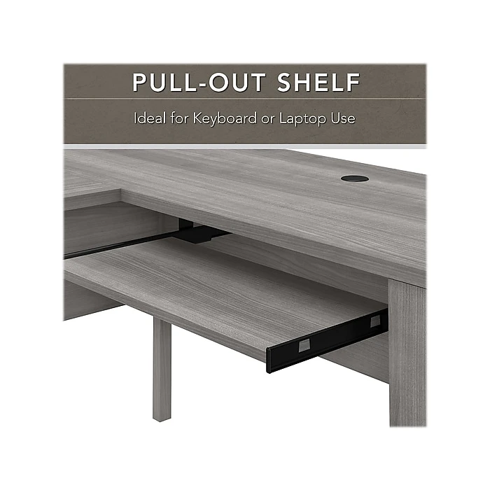 Build your ideal home office around the Bush Furniture Somerset 60″W L-shaped desk featuring transitional style and plenty of storage space for work materials. Maximize the potential of your home office with this desk. Create your remote work headquarters with space for a computer, phone, printer, and more on a surface that features a wire management grommet for keeping cords and cables in order. A convenient pull-out tray provides a perfect place to keep a keyboard or laptop, and the desk also includes a vertical storage cabinet with an adjustable shelf. Place pens, paper, and more in the box drawer, and enjoy a file drawer gliding on smooth ball bearing slides for an easy reach to documents. The transitional styling includes an elegant finish with tapered legs and contemporary metal hardware for an alluring appearance. This L-shaped desk with storage is tested to meet ANSI/SOHO standards for safety and performance and is backed by the Bush Furniture 6-year manufacturer warranty. American-made with US and imported parts.