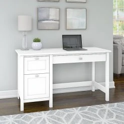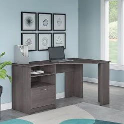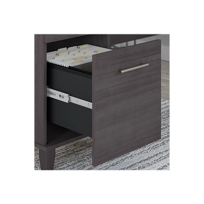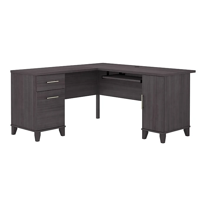 Build your ideal home office around the Bush Furniture Somerset 60″W L-shaped desk featuring transitional style and plenty of storage space for work materials. Maximize the potential of your home office with this L-shaped desk. Create your remote work headquarters with the space for a computer, phone, printer, and more on a surface that features wire management grommets for keeping cords and cables in order. A convenient pullout tray provides a perfect place to keep a keyboard or laptop, and the desk also includes a vertical storage cabinet with an adjustable shelf. Place pens, paper, and more in the box drawer, and enjoy a file drawer gliding on smooth ball bearing slides for an easy reach to documents. The desk in transitional styling offers an elegant finish with tapered legs and contemporary metal hardware for an alluring appearance. This L-shaped desk with storage is tested to meet ANSI/SOHO standards for safety and performance and is backed by the Bush Furniture 6-year manufacturer limited warranty. American-made with US and imported parts.