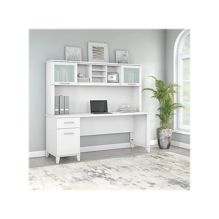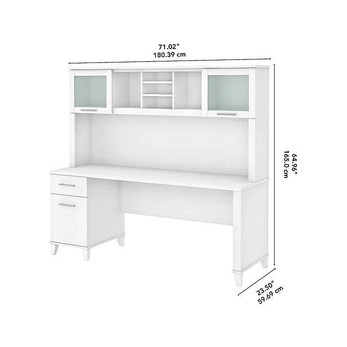 The transitional Bush Furniture Somerset 71″ office desk with hutch offers a stylish and practical workspace solution for the home or small office. A spacious work surface and plenty of storage capacity make this office desk with drawers and hutch a perfect choice for your home office. Spread out with a computer and paperwork while multitasking on an expansive desktop that includes wire management to keep cords and cables in order. The desk’s file drawer opens on smooth full-extension ball bearing slides for easy access to legal- and letter-size documents, while the box drawer keeps the office supplies and utensils you need close by. The hutch attaches to the desktop and adds a pair of frosted glass doors for concealed storage in addition to open cubby spaces with three shelves for books, decorations, and more. This home office desk with drawers and hutch set is tested to meet ANSI/SOHO quality standards for safety and performance and is backed by the Bush Furniture 6-year manufacturer warranty.