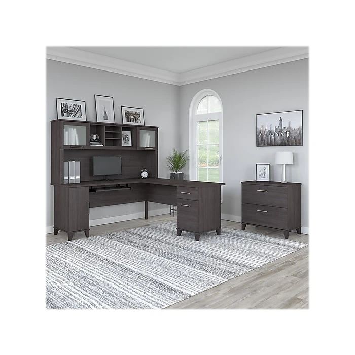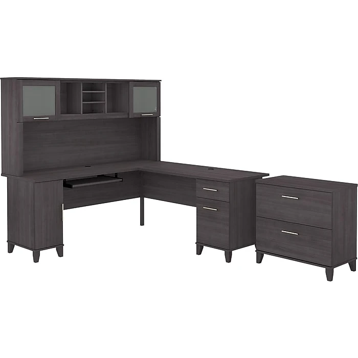 • Enhance your workspace with the Bush Furniture Somerset 72″W L-Shaped Desk, featuring a hutch and lateral file cabinet in a sleek Storm Gray finish. Perfect for maximizing productivity and organization.