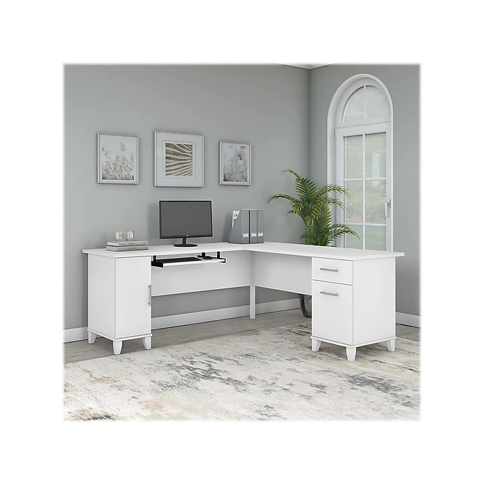 Build your home office around the Bush Furniture Somerset 72″W L-shaped desk with storage, featuring transitional style and plenty of space for materials. Maximize the potential of your home office with this desk. Create your remote work headquarters with space for a computer, phone, printer, and more on a surface that features wire management grommets for keeping cords and cables in order. A convenient pull-out tray provides a perfect place to keep a keyboard or laptop, and the desk also includes a vertical storage cabinet with an adjustable shelf. Place pens, paper, and more in the box drawer, and enjoy a file drawer gliding on smooth ball bearing slides for an easy reach to documents. Transitional styling offers an elegant finish with tapered legs and contemporary metal hardware for an alluring appearance. This desk with storage is tested to meet ANSI/SOHO standards for safety and performance and is backed by the Bush Furniture 6-year manufacturer warranty. American-made with US and imported parts.