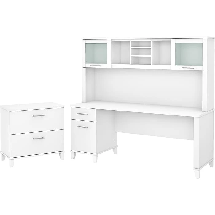 • The Bush Furniture Somerset 72″ White Laminated Wood Computer Desk offers a sleek and functional workspace solution. Designed with a durable laminated wood finish, this desk is built to last while maintaining a modern aesthetic.