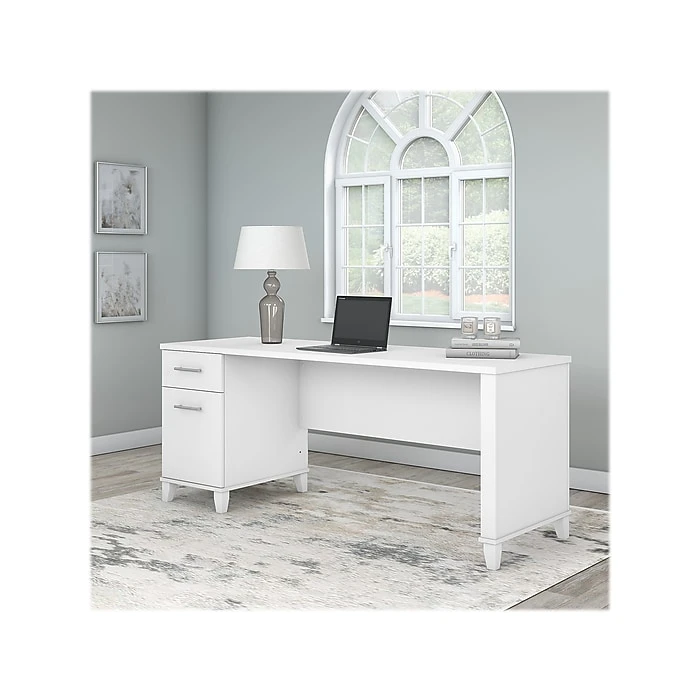 An expansive work surface and built-in storage make the Bush Furniture Somerset office desk with drawers a perfect choice for your home office. The spacious desktop offers plenty of room to spread out with a computer and paperwork and includes a wire management grommet to keep cords and cables secure and out of sight. The desk’s file drawer opens on full-extension ball bearing slides for easy access to legal- and letter-size documents, while a box drawer keeps the office supplies and utensils you need close by. A finished back side allows the desk to look great no matter where it’s positioned in the room. The office desk with drawers meets or exceeds ANSI/SOHO standards for safety and performance and is backed by a 6-year manufacturer limited warranty.