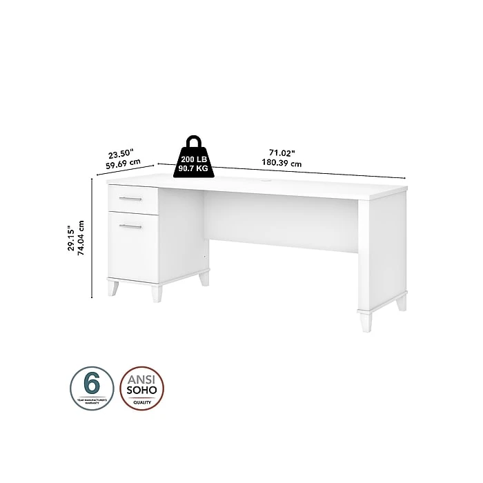 - Spacious 71″W work surface offers plenty of room to spread out with a computer and paperwork