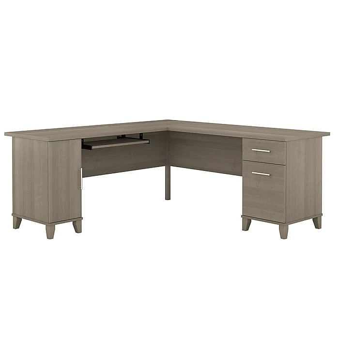 Maximize the potential of your home office with the Bush Furniture Somerset 72W L Shaped Desk. Create your remote work headquarters with space for a computer, phone, printer and more on a surface that features wire management slots for keeping cords and cables in order. A convenient pull-out shelf provides a perfect place to keep a keyboard or laptop, and the Desk also includes a vertical storage cabinet with an adjustable shelf. Place pens, paper and more in the box drawer, and enjoy a file drawer gliding on smooth ball bearing slides for an easy reach to documents. Transitional styling includes a stylish finish with tapered legs and contemporary metal hardware for an alluring appearance. This quality office desk is tested to meet ANSI/SOHO standards for safety and performance and is backed by the Bush Furniture 6 Year Manufacturer’s Warranty. American made with U.S. and imported parts.