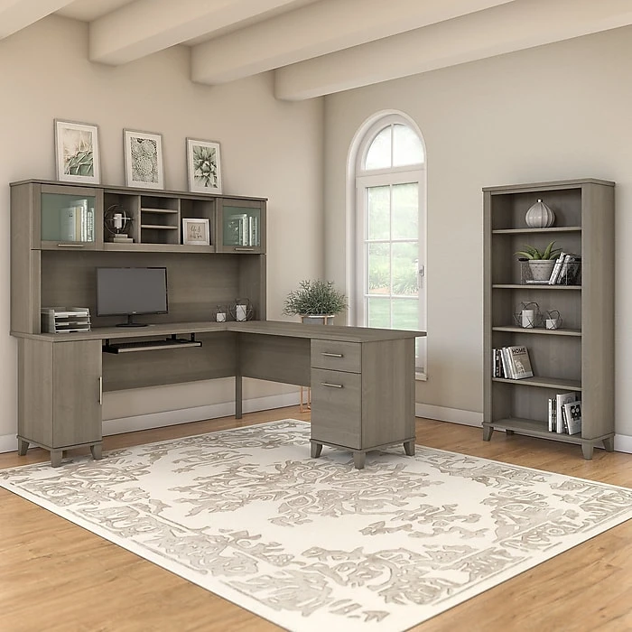 With practical features and a stylish design, the Bush Furniture Somerset 72W L Shaped Desk with Hutch and 5 Shelf Bookcase delivers a personal workspace perfect for the home or small office. The 72W surface with wire management offers ample room to spread out while a pull-out shelf for a keyboard or laptop, vertical cabinet, box drawer and file drawer offer plenty of storage. The Hutch features large open compartments and 2 lift-up frosted glass doors for concealed storage. Two of the Bookcase’s shelves are fixed for stability and 3 are adjustable to ensure that items of all sizes have their place. Transitional styling includes your choice of four stylish finishes with tapered leg accents and contemporary metal hardware. This office furniture set is tested to meet ANSI/SOHO standards for safety and performance and is backed by the Bush Furniture 6 Year Manufacturer’s Warranty.