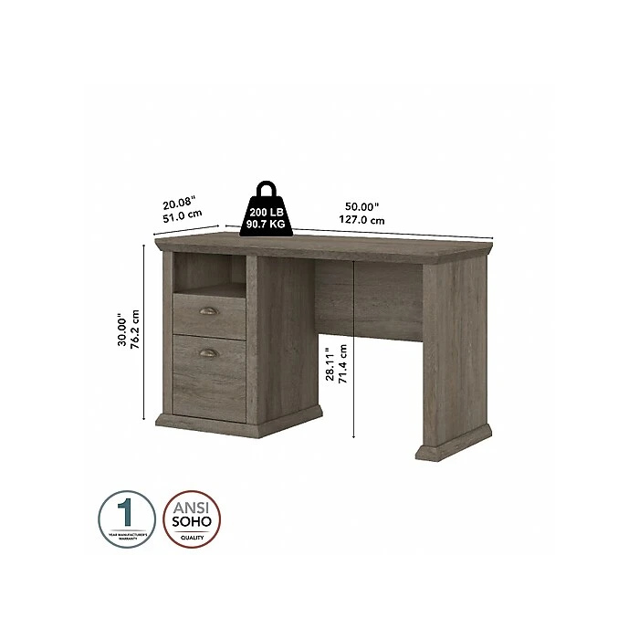 The Bush Furniture Yorktown 50″W home office desk with storage is a great way to maximize the potential of your personal workspace. Designed for placement against a wall, the small computer desk saves valuable floor space while still providing ample room for you to work comfortably. Its durable work surface easily supports a computer, books, and more with a weight capacity of 200 lbs., so you can keep important materials on hand as you take on your next project or assignment. Storage features include a file drawer that opens on smooth full-extension ball bearing slides for an effortless reach to letter-size paperwork, a box drawer for miscellaneous office supplies, and an open cubby shelf for work in progress.