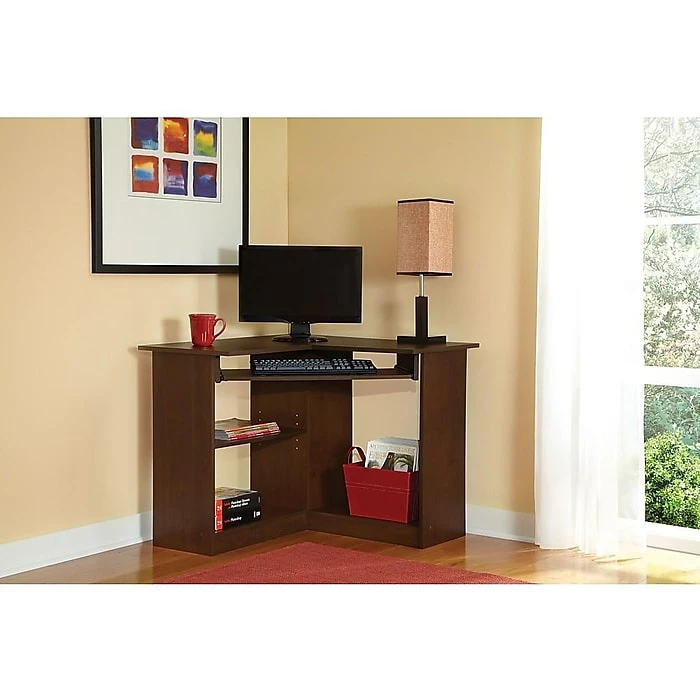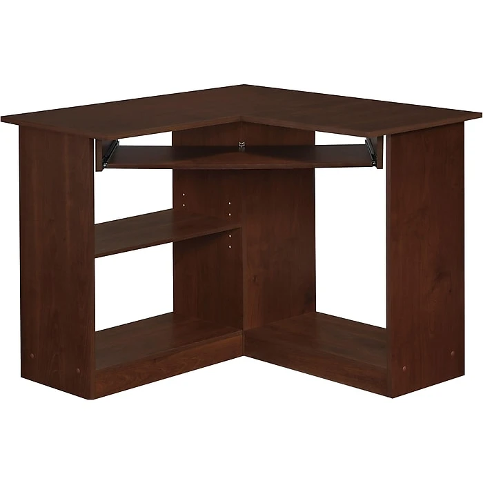 Upgrade a home or office corner with this V-shaped computer desk in laminated resort cherry finish. The two open shelves accommodate books and file folders, and the adjustable shelf offers a customizable space for work essentials. The sturdy tabletop of this Easy 2 Go computer desk provides neat organization for a desktop system, and the space-saving pull-out tray easily fits a keyboard.